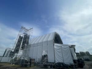 Le plateau scénique couvert peut aller de 24m2 à 388m2, la scène peut être entourée d’extensions techniques à cour, jardin et au lointain, bâchée ou non. Elle peut également être complétée par des tours sons, supports écran ou autre structure pour accueillir de la décoration.