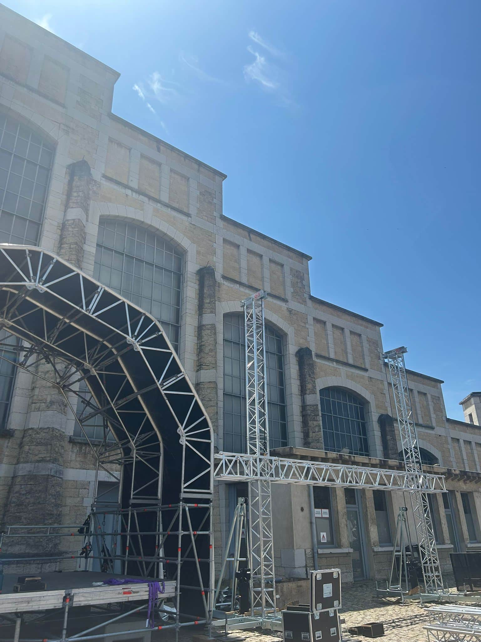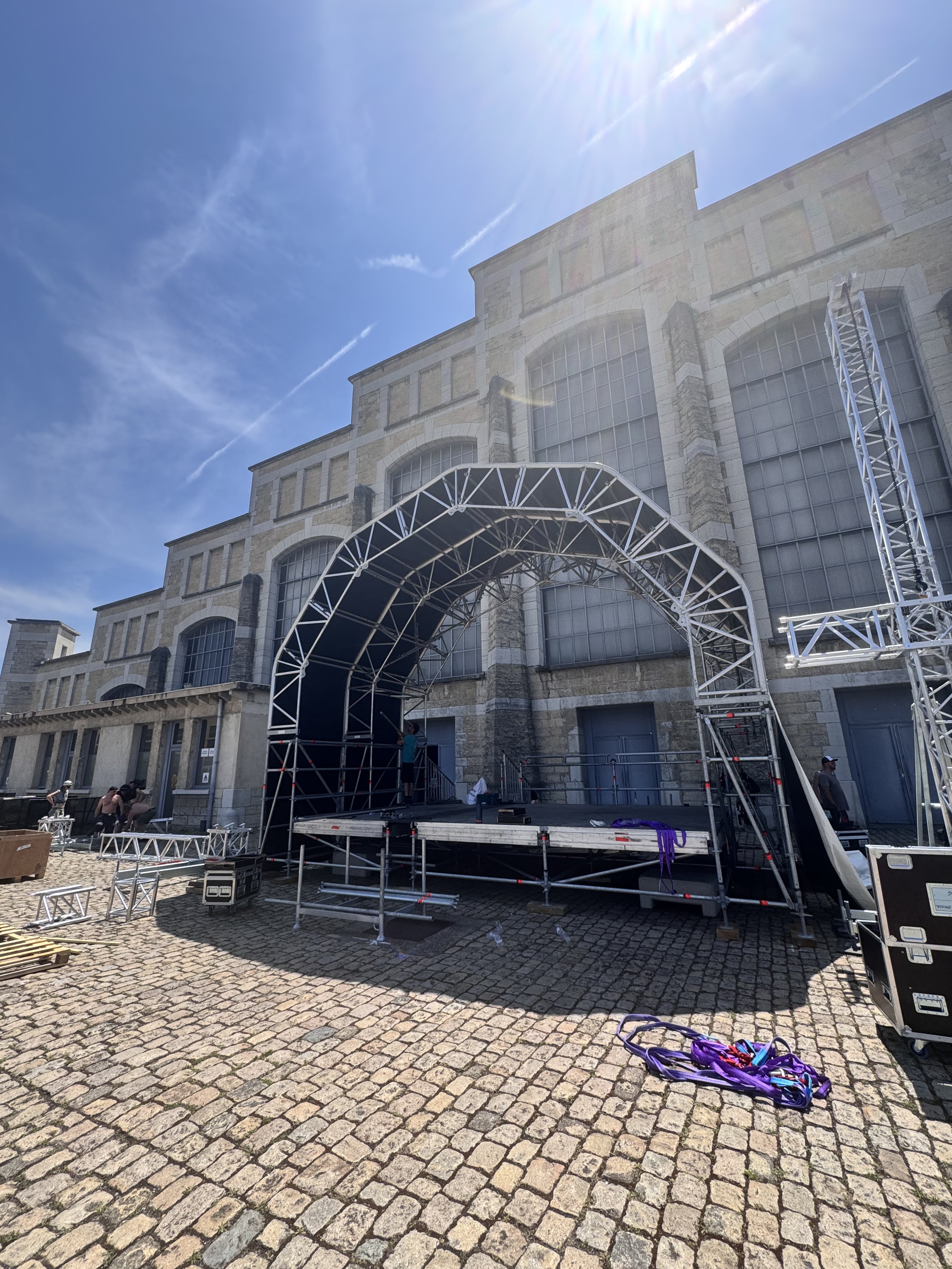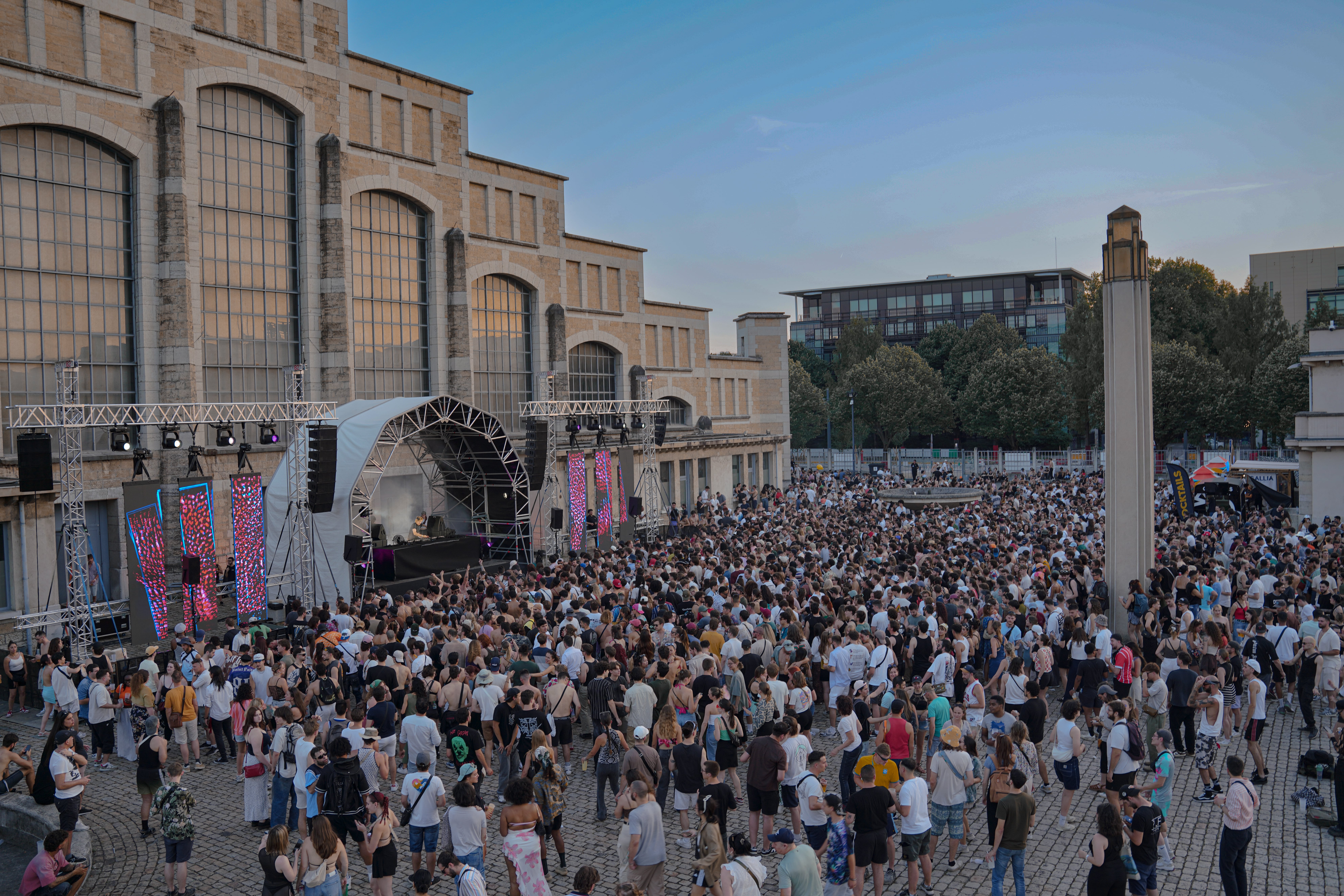 Stage UP a installé sa scène « Baby » Igloo sur le parvis de la Halle complétée par 2 supports écran et son Sixty82 Multibase.