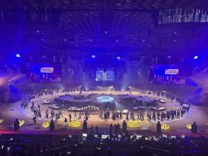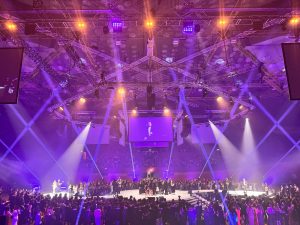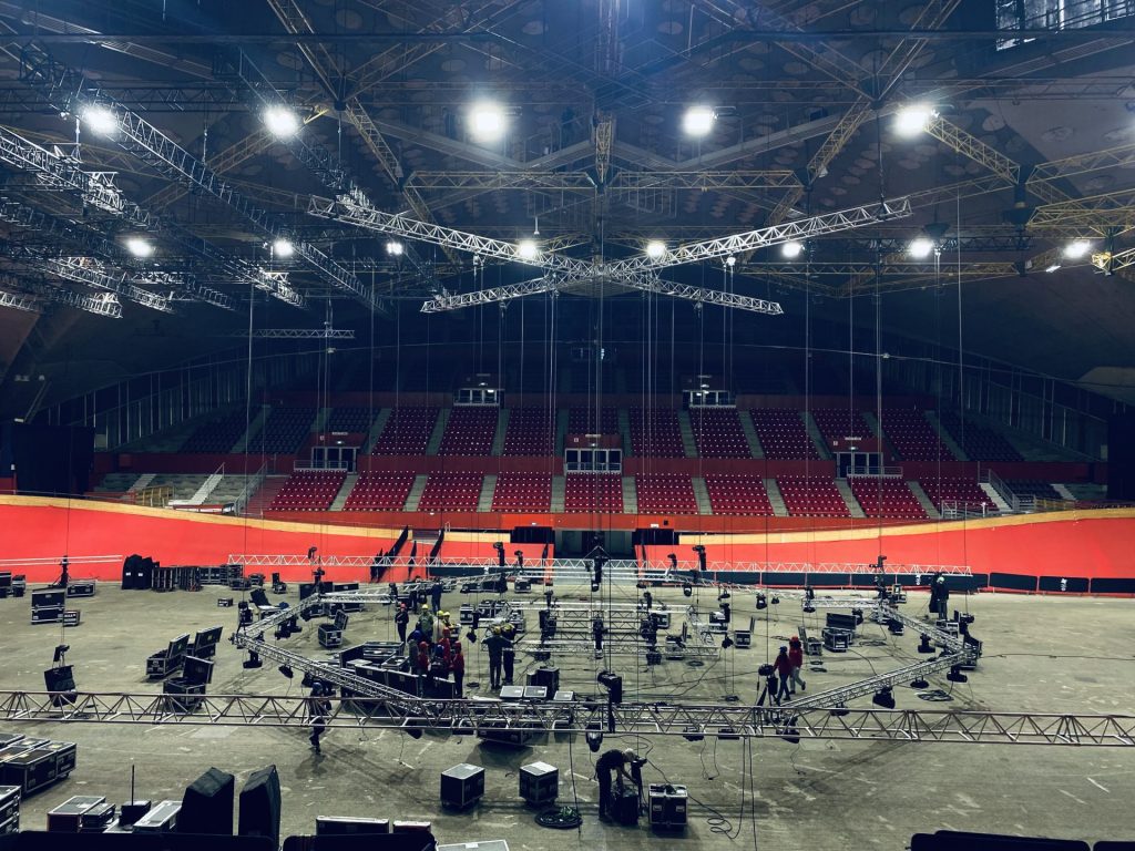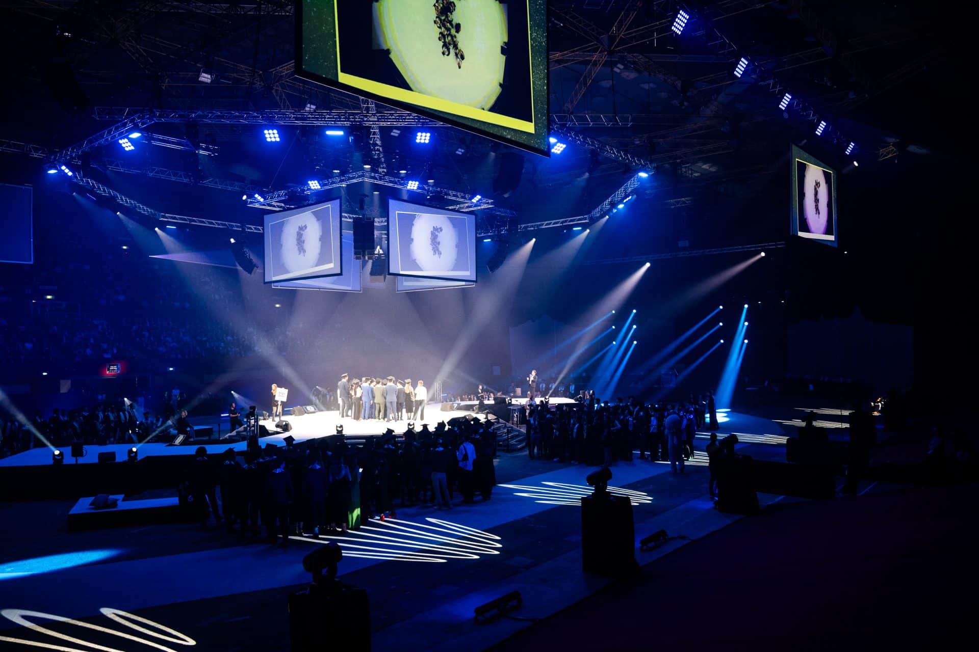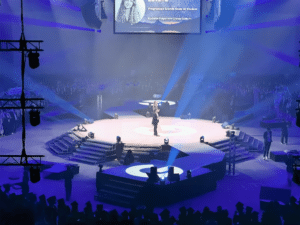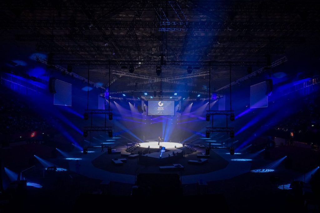 Stage UP a conçu et mis en œuvre : la scène dodécagone Layher dites ©Géodude et toutes les accroches son, lumières, vidéo, photo et déco.